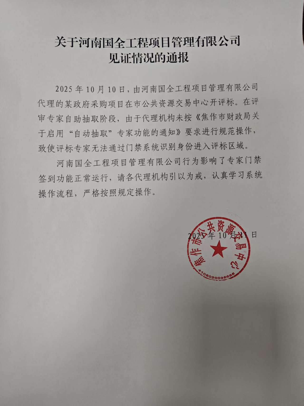 关于河南国全工程项目管理有限公司见证情况的通报