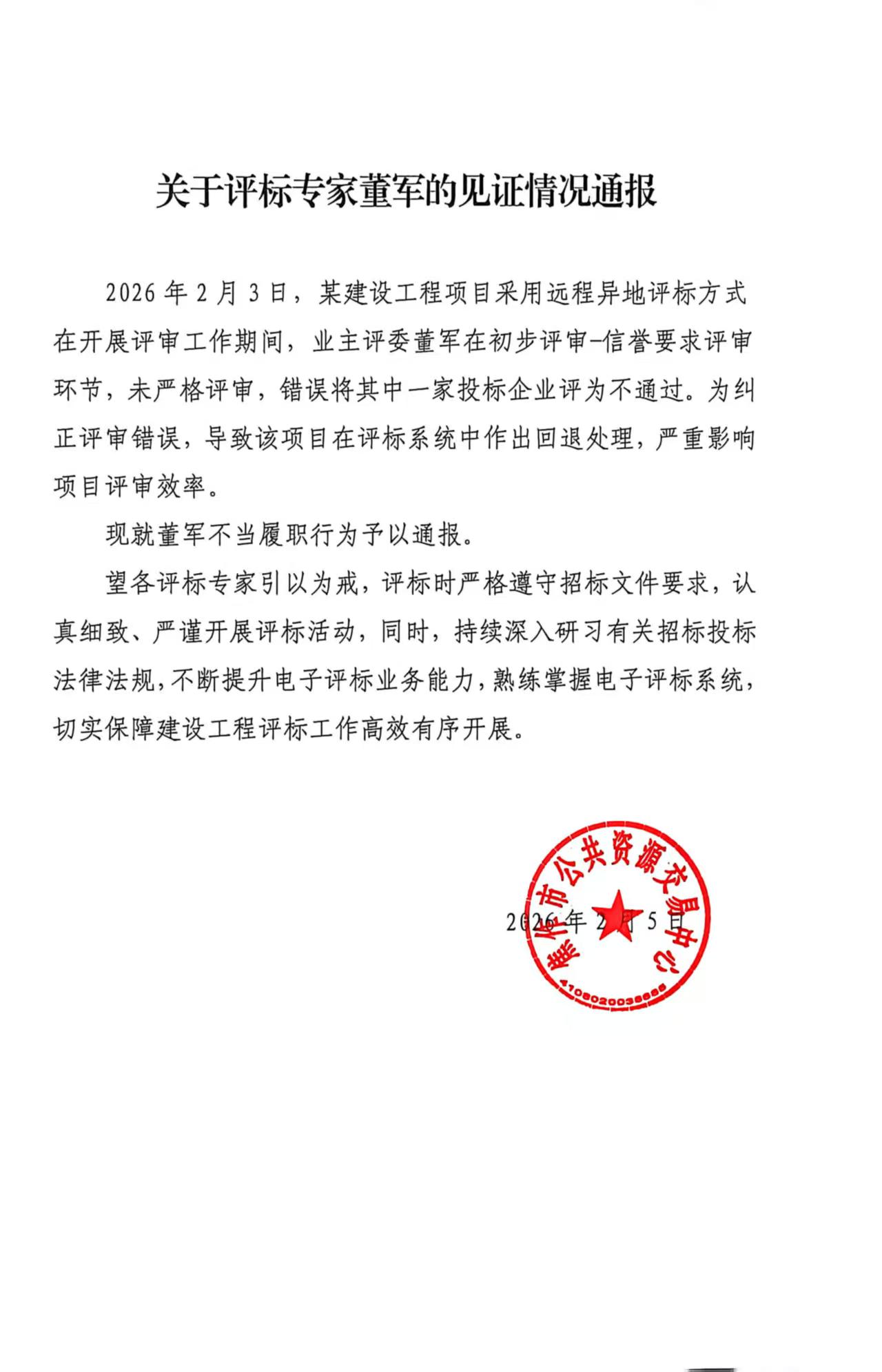 关于评标专家董军的见证情况通报