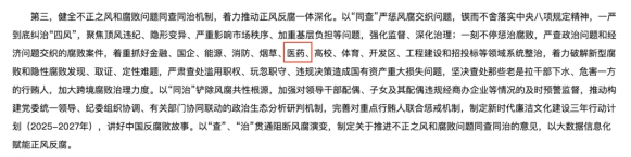 国家卫健委等14部委发布的《2025年纠正医药购销领域和医疗服务中不正之风工作要点》也提到,发挥穿透式审计监督优势,加强医药行业专项审计。打通从原材料采购、药品耗材生产、招标采购的监管通路,将监管重点向生产端覆盖。